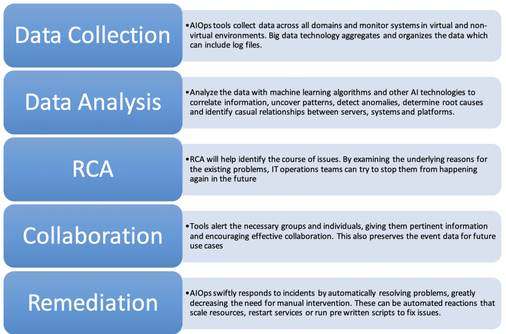 - AIOps carries out root cause analysis to assist in locating the origin of problems. IT operations teams can attempt to prevent disruptions from recurring by looking into the root causes of current issues.